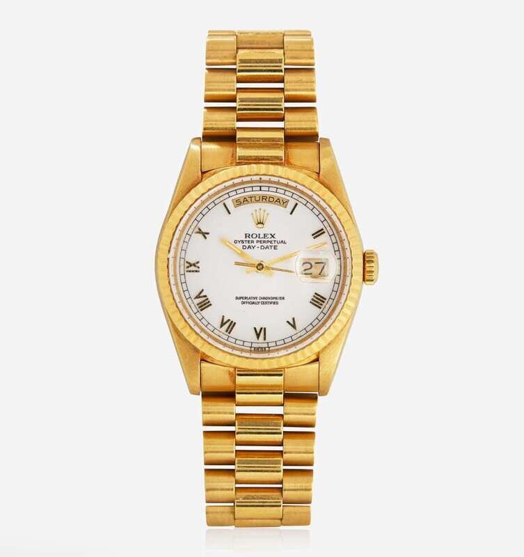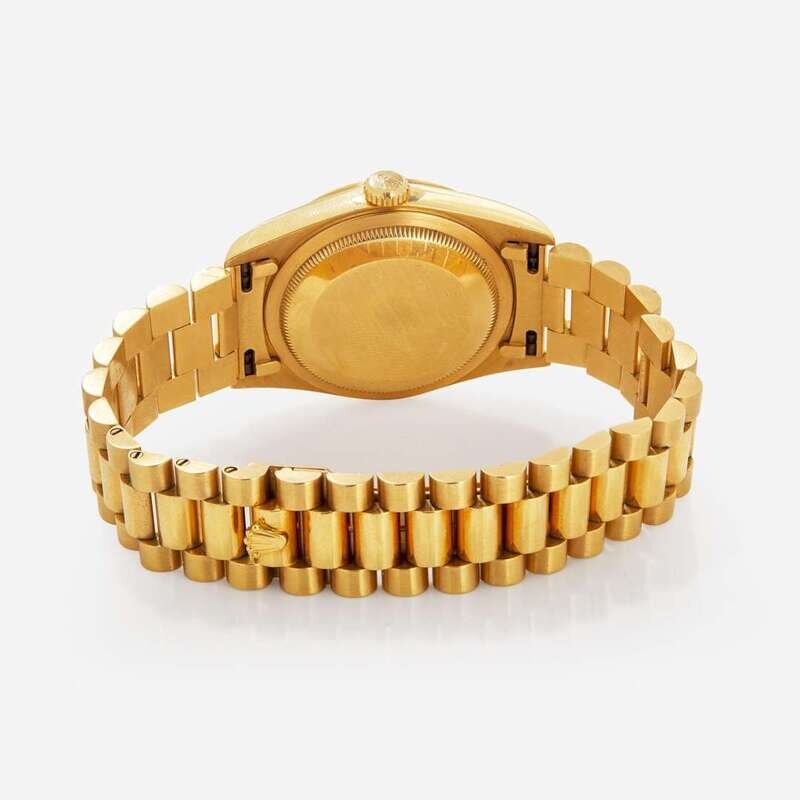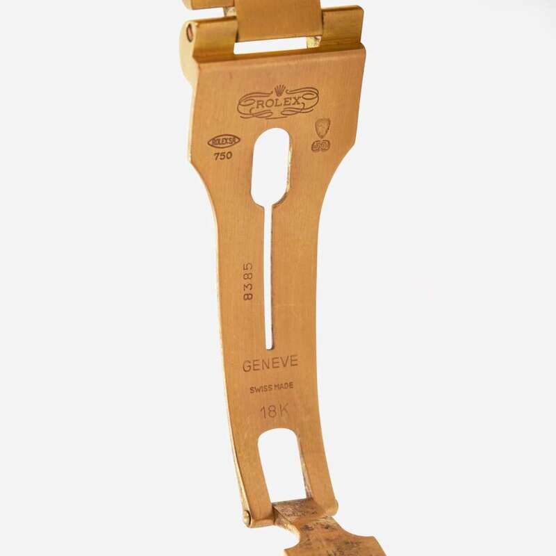 Overall Condition: Light scratches and wear to metal, clasp in working order, watch currently running and keeping time, screw-down crown in working order, may require additional cleaning, dial reads “ROLEX OYSTER PERPETUAL DAY-DATE SUPERLATIVE CHRONOMETER OFFICIALLY CERTIFIED SWISS”, back of case stamped “750”, clasp reads “ROLEX ROLEXSA 750 18K 8385 GENEVE SWISS MADE”.