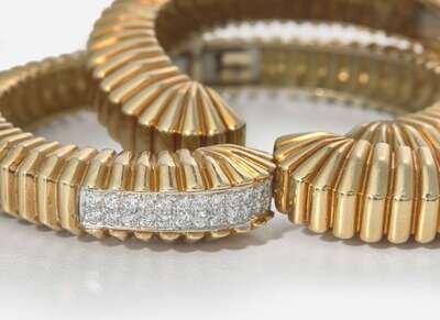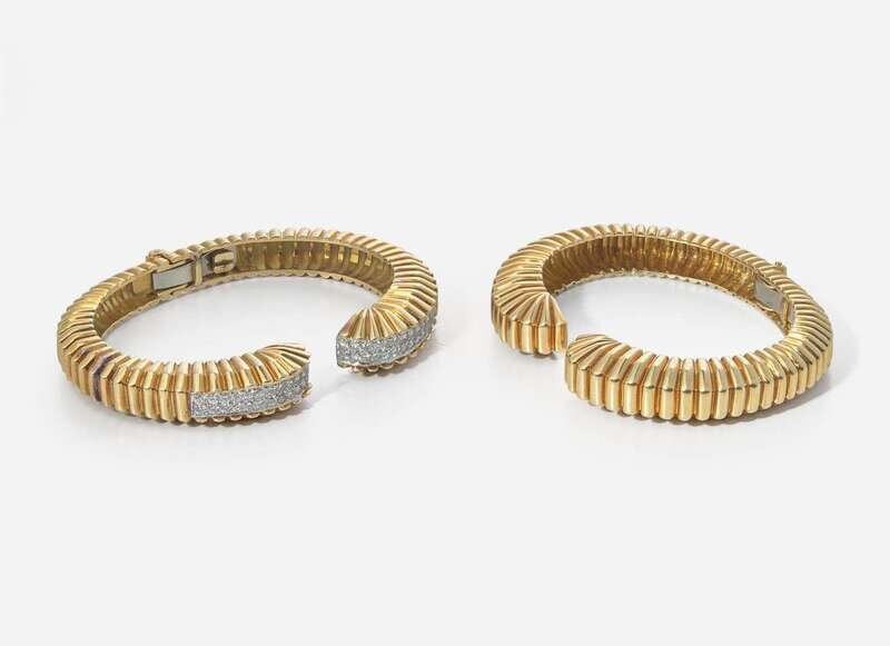 Overall Condition: Light scratches and wear to metal, patina developing in some areas, hinge clasps in working order, both bracelets stamped "18K". Diamonds: Fifty-six round brilliant-cut diamonds each measuring approximately 2.00mm, near colorless (G - J), with VS clarity. Total estimated weight of diamonds: 1.68 carats.