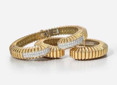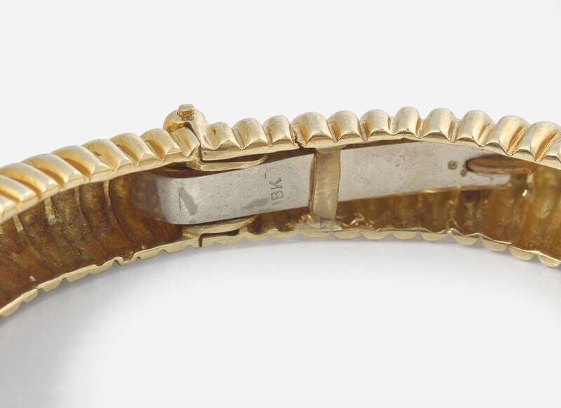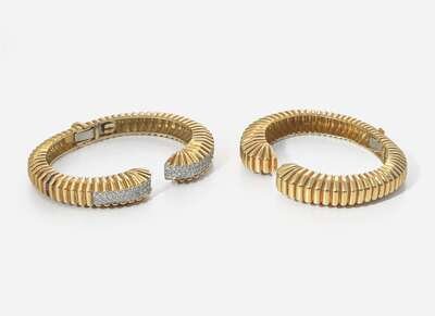 A pair of matching 18K yellow gold bracelets, designed as ridged geometric bangles with hinge closures, one of which is pavé-set with round brilliant-cut diamonds. Diamonds are near colorless (G - J), with VS clarity. Total estimated weight of diamonds: 1.68 carats.