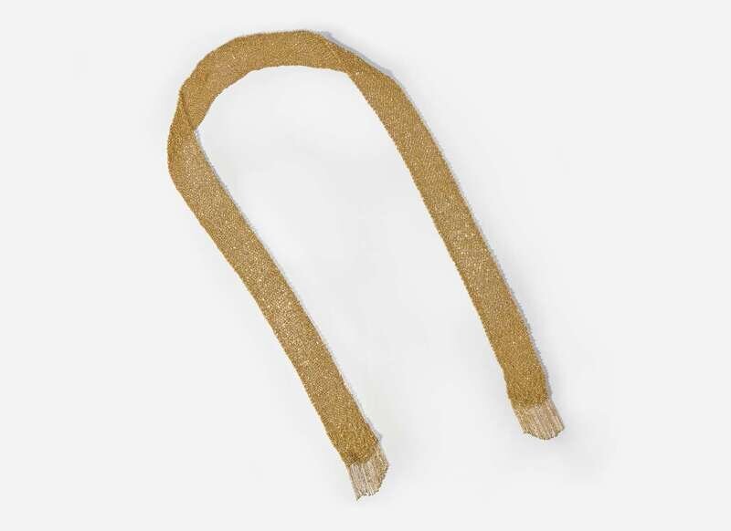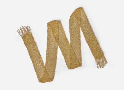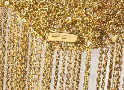 A highly flexible Italian 18K yellow gold mesh necklace that can be worn as a scarf or a belt, with gold chain fringe on either end.