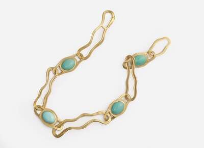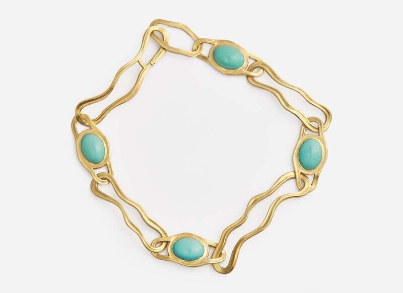 An Angela Cummings for Tiffany & Company necklace circa 1982, designed as organic links crafted from 18K yellow gold, and set with four cabochon Persian turquoise each measuring approximately 12.97mm x 17.40mm.