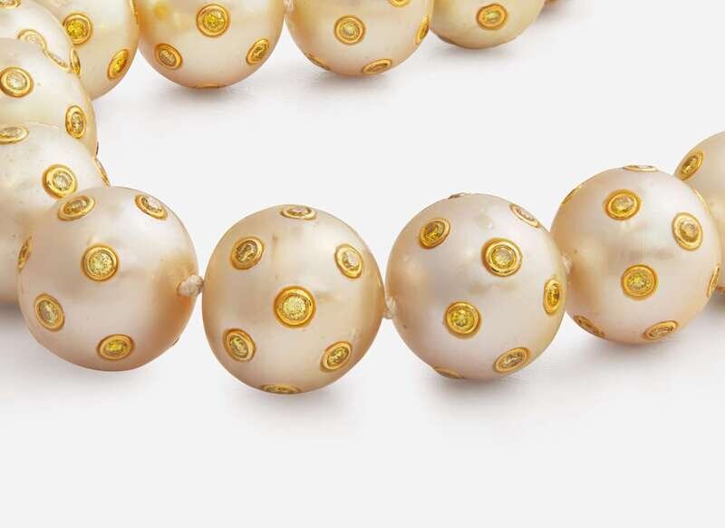 A graduated South Sea pearl necklace, strung with orangey yellow South Sea pearls measuring from approximately 10.00mm at the smallest to approximately 12.00mm at the largest in the center of the necklace, with each pearl bead set with round brilliant-cut Fancy yellow diamond accents, and further round brilliant-cut yellow diamonds pavé-set on the round clasp. Total estimated weight of diamonds: 9.15 carats.