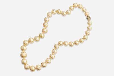 Pearls: Thirty-seven round South Sea pearls with orangey yellow body color measuring from approximately 10.00mm at the smallest to approximately 12.00mm at the largest, with significant pitting.