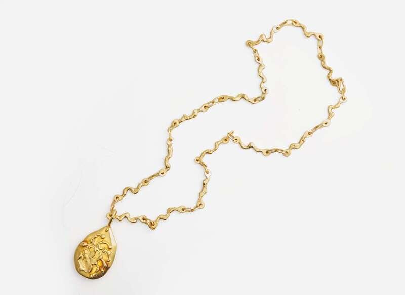 A 22K yellow gold necklace by prominent artist duo Jean Mahie, feature an egg-shaped pendant with amorphous applied symbols in yellow gold, on a chain of stick-like asymmetrical links ending in a hook clasp.