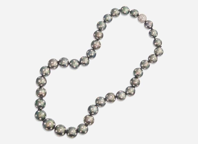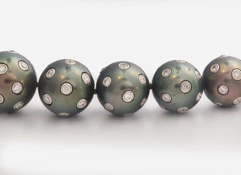 A graduated Tahitian pearl necklace, strung with black Tahitian pearls measuring from approximately 10.00mm at the smallest to approximately 15.00mm at the largest in the center of the necklace, with each pearl bead set with round brilliant-cut diamond accents, and further round brilliant-cut diamonds pavé-set on the round clasp. Diamonds are near colorless (G - J), with SI - I clarity. Total estimated weight of diamonds: 10.90 carats.