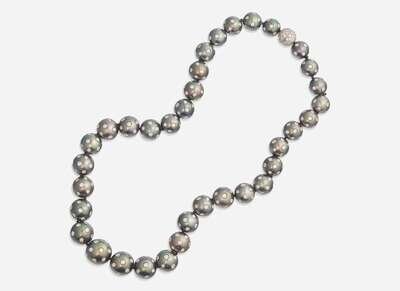 Pearls: Thirty-five black Tahitian pearls measuring from approximately 10.00mm at the smallest to approximately 15.00mm at the largest, with significant pitting.