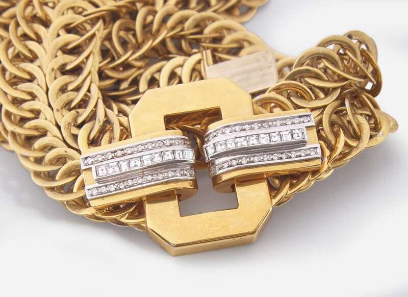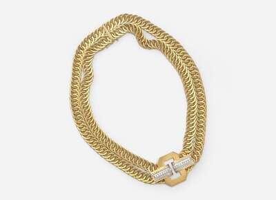 An 18K yellow gold necklace by Weingrill, designed as two adjacent strands of circular fancy link chain, all meeting at the center in an octagonal pendant accented by princess-cut and round brilliant-cut diamonds in white gold settings. Diamonds are near colorless (G - J), with VS - SI clarity. Total estimated weight of diamonds: 0.75 carats.