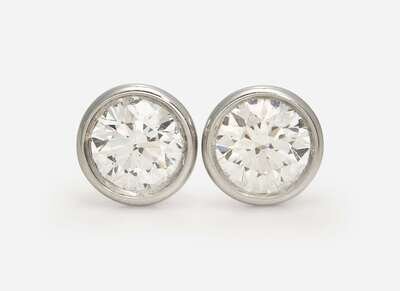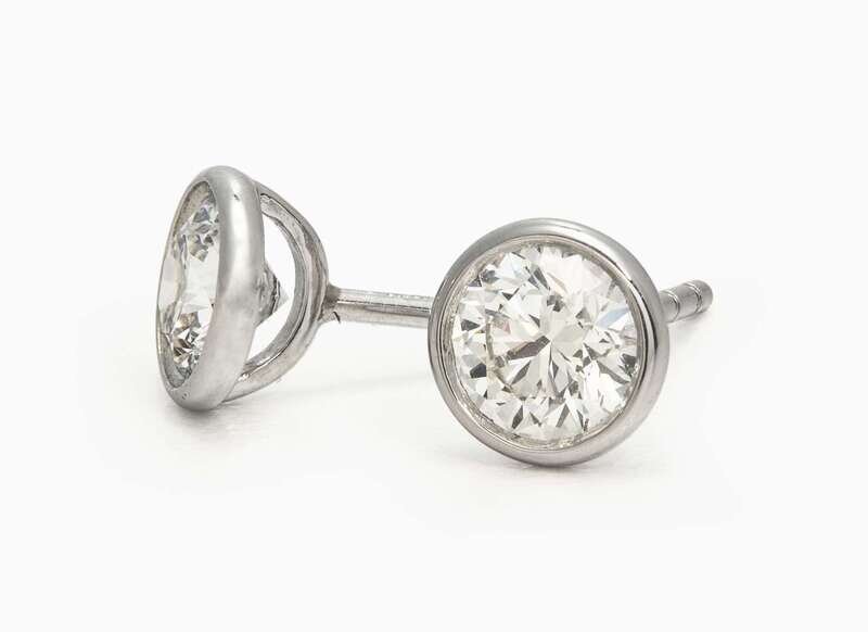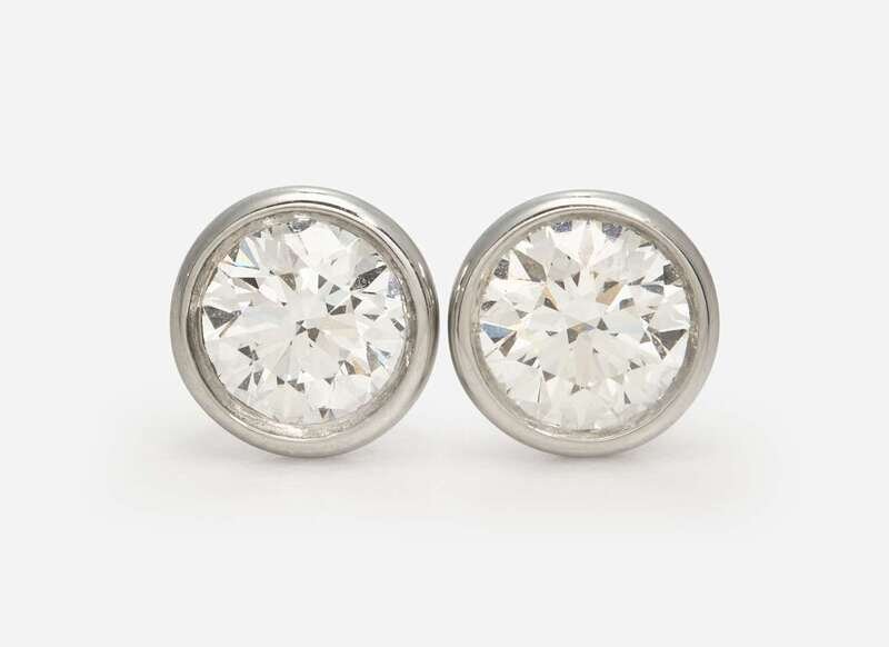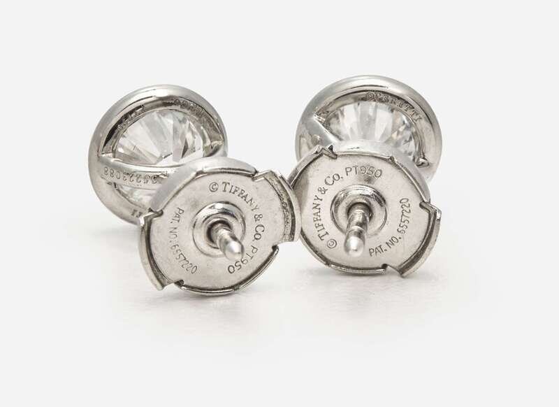 A pair of platinum stud earrings by Elsa Peretti for Tiffany & Company, each set with a colorless (F) round brilliant-cut diamond weighing approximately 0.79 carats, with VVS1 and VVS2 clarity respectively. Total estimated weight of diamonds: 1.58 carats. Accompanied by copy of Tiffany & Co. diamond certificates.