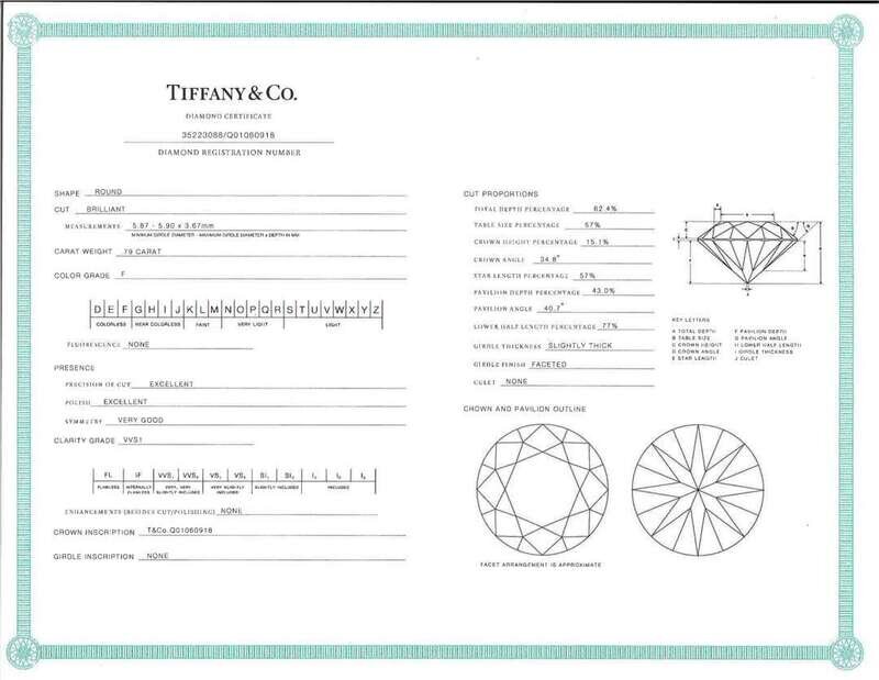 Diamond: One round brilliant-cut diamond measuring approximately 5.87mm - 5.90mm x 3.67mm, colorless (F), with VVS1 clarity, and no fluorescence. Estimated weight of diamond: 0.79 carat. Accompanied by copy of Tiffany & Co. Diamond Certificate: 35223088/Q01060918.