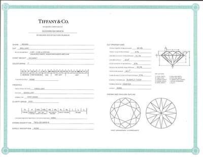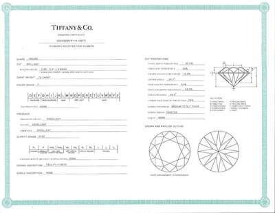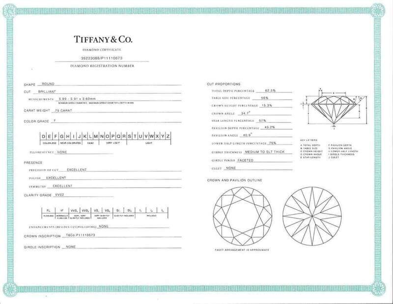 Diamond: One round brilliant-cut diamond measuring approximately 5.89mm - 5.91mm x 3.69mm, colorless (F), with VVS2 clarity, and no fluorescence. Estimated weight of diamond: 0.79 carat. Accompanied by copy of Tiffany & Co. Diamond Certificate: 35223088/P11110673.