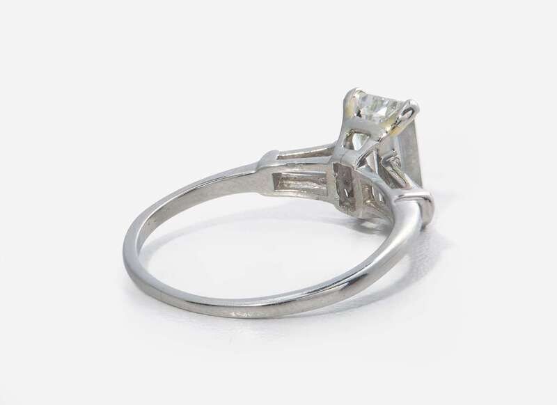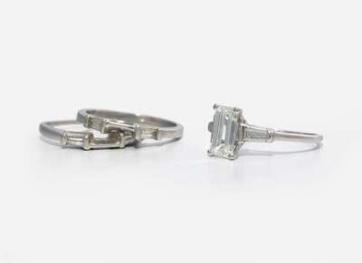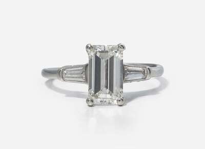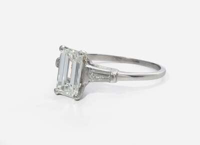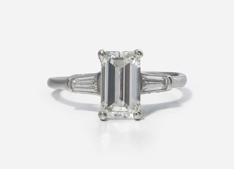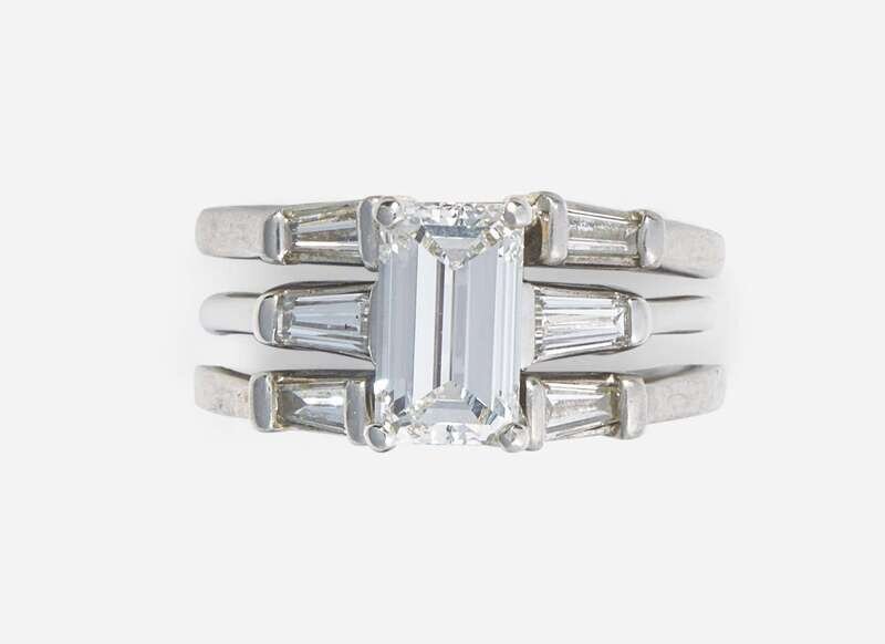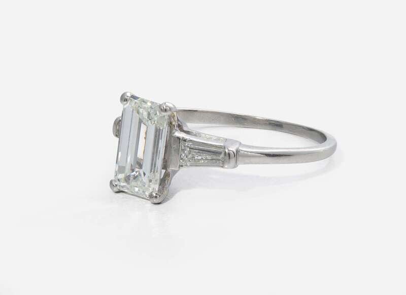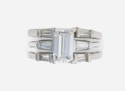A platinum ring centering a 1.61 carat emerald-cut diamond with (G) color and VVS2 clarity, flanked by two tapered baguette-cut diamonds, accompanied by two matching ring guards set with tapered baguette-cut diamonds to frame the diamond in the central ring. Accent diamonds are near colorless (G - J), with VS - SI clarity. Total estimated weight of diamonds: 2.05 carats. Accompanied by GIA Report Number: 2235101986.