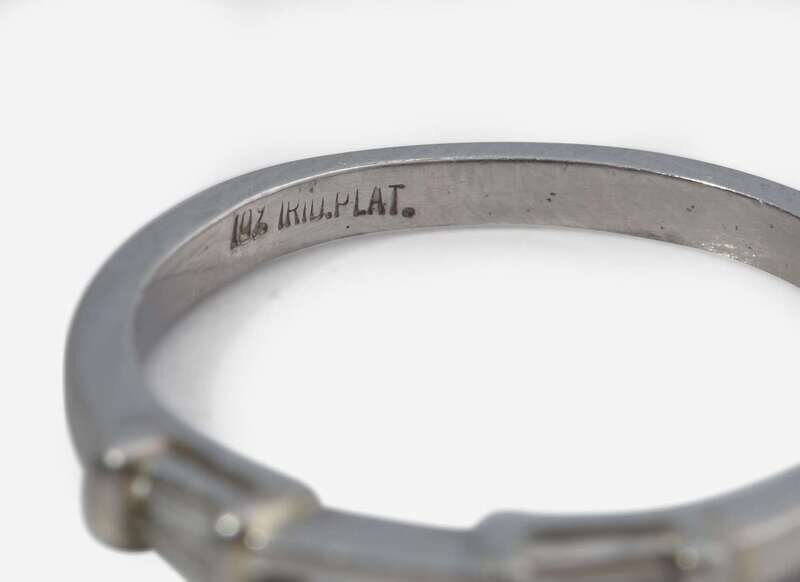 Overall Condition: Scratches and wear to metal on all rings, one ring guard stamped “10%IRIDPLAT.”, one ring guard partially legibly stamped “10”, central ring engraved “G.W.Ma” with further engraving rubbed away, all rings testing as platinum.