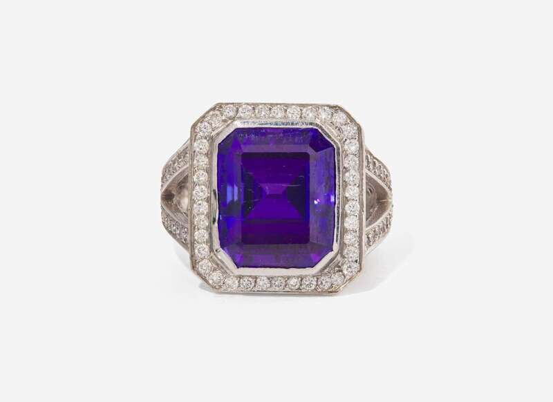 Tanzanite: One bezel-set emerald-cut tanzanite measuring approximately 10.81mm x 12.79mm.