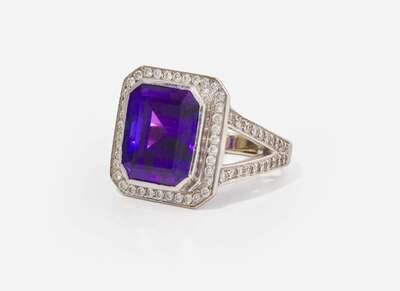 An 18K white gold ring centering a bezel-set emerald-cut tanzanite, surrounded by a halo of round brilliant-cut diamonds, with further diamonds leading down the openwork tapered shank. Diamonds are near colorless (G - J), with SI - I clarity. Total estimated weight of diamonds: 0.70 carats.