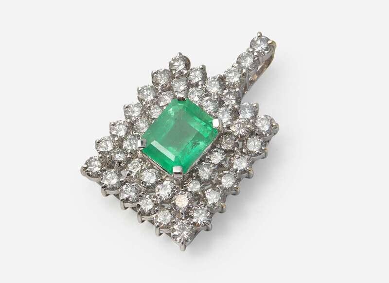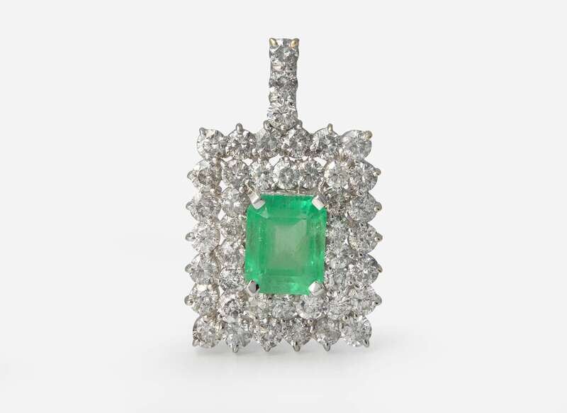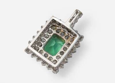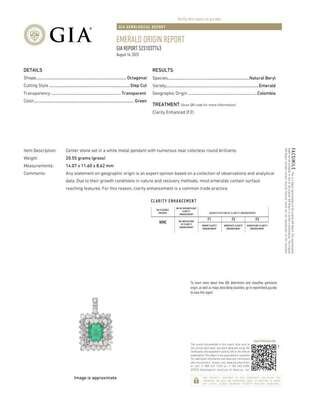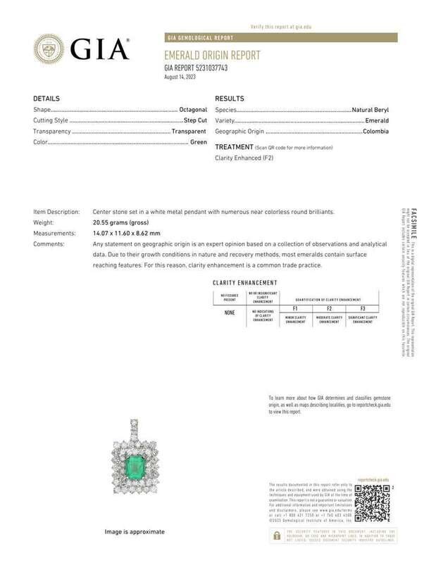 A 14K white gold pendant, centering a natural beryl octagonal step-cut transparent green Colombian emerald, surrounded by round brilliant-cut diamonds. Diamonds are near colorless to faint color (G - K), with I clarity. Total estimated weight of diamonds: 13.50 carats. Emerald accompanied by GIA Report Number: 5231037743.