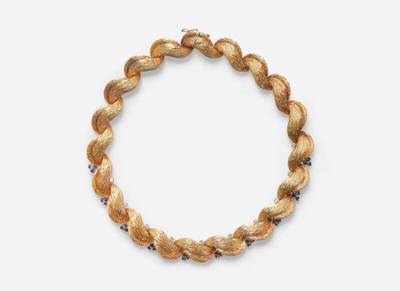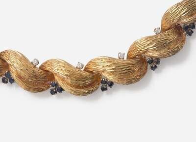 An 18K yellow gold collar necklace, designed as textured twists of yellow gold punctuated by clusters of round-cut sapphires and further accented by delicate round brilliant-cut diamonds. Diamonds are near colorless (G - J), with VS - SI clarity. Total estimated weight of diamonds: 0.50 carats.