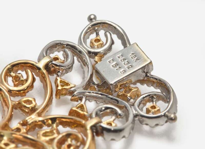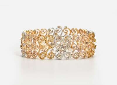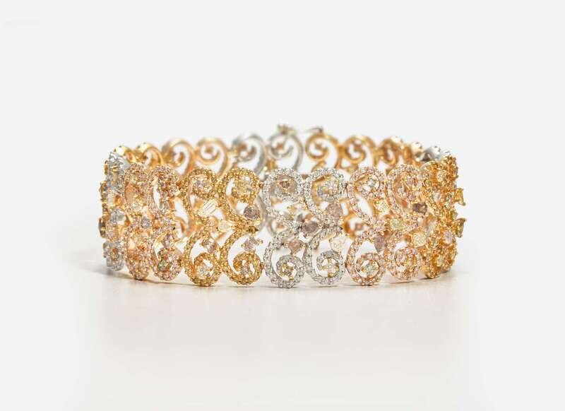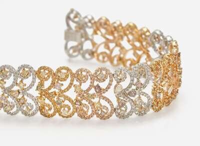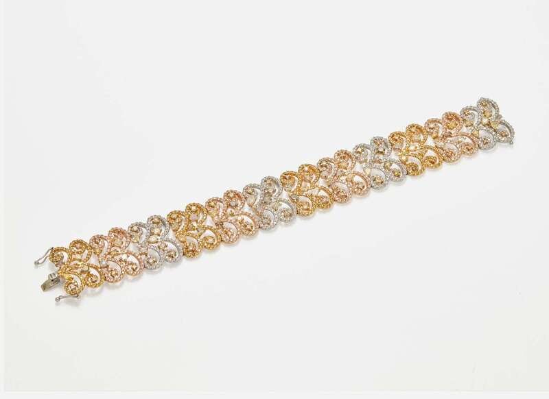A three-tone 18K gold bracelet, designed as openwork sections of alternating rose, white, and yellow gold swirls set throughout with variously-sized round brilliant-cut, pear-cut, cushion-cut, oval-cut, triangular-cut, and rectangular-cut multicolor diamonds, including near colorless, pink, brown, yellow, purple, and green. Diamonds have SI - I clarity. Total estimated weight of diamonds: 11.50 carats.
