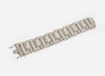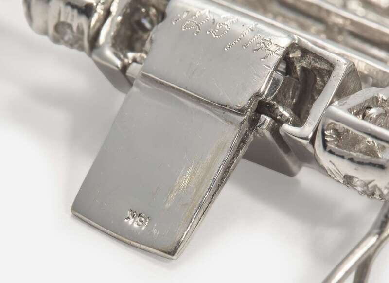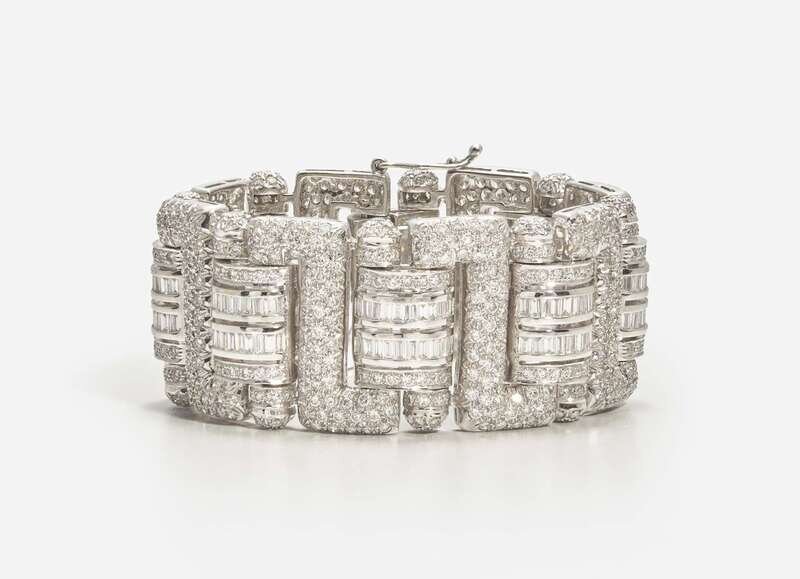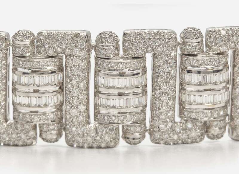 A wide 18K white gold diamond, designed in a geometric style with zig-zag links, featuring numerous round brilliant-cut and straight baguette-cut diamonds. Diamonds are near colorless (G - J), with SI - I clarity. Total estimated weight of diamonds: 41.60 carats.