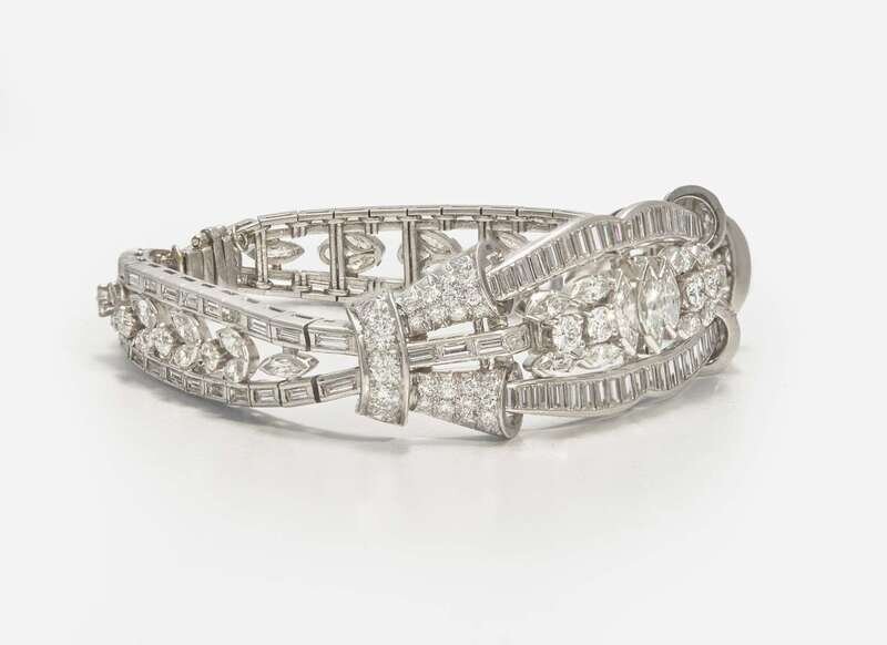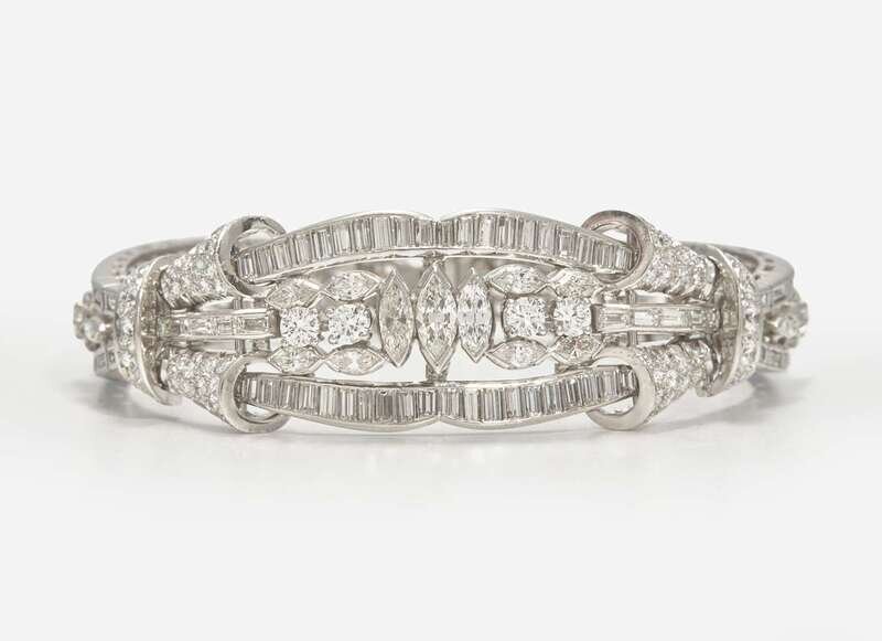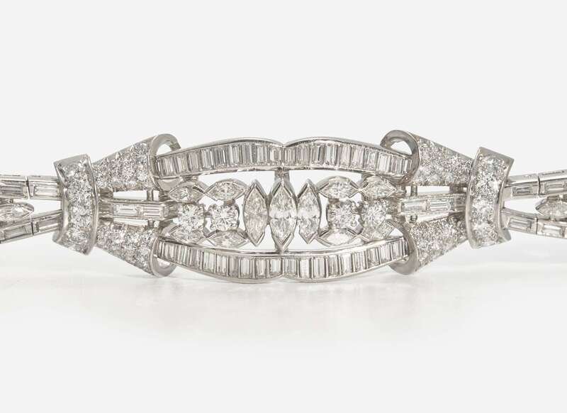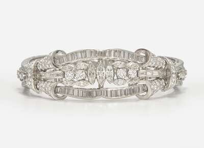 Diamonds: One hundred four variously sized straight baguette-cut diamonds, sixty-six round brilliant-cut diamonds measuring from approximately 1.50mm at the smallest to approximately 3.30mm at the largest, and thirty-one variously-sized marquise-cut diamonds, near colorless (H - J), with VS - SI clarity. Total estimated weight of diamonds: 8.00 carats.
