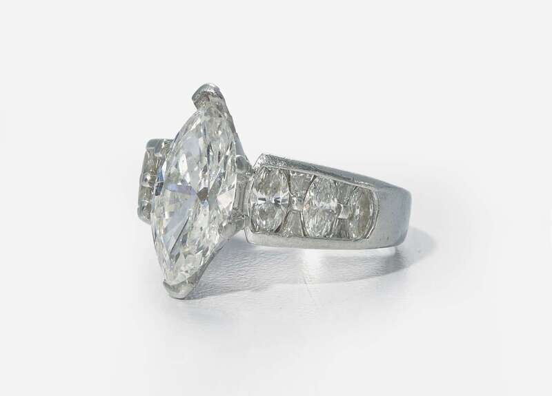 A ladies platinum ring featuring a prominent 3.07 carat marquise brilliant-cut diamond with clarity characteristics that include a laser drill hole, crystal, feather, cavity, needle.(I) color, SI2 clarity and no fluorescence, with marquise-cut and tapered baguette-cut accent diamonds set in the wide band. Accent diamonds are near colorless (G - J), with SI clarity. Total estimated weight of diamonds: 4.43 carats. Accompanied by GIA Report Number: 6234070015.