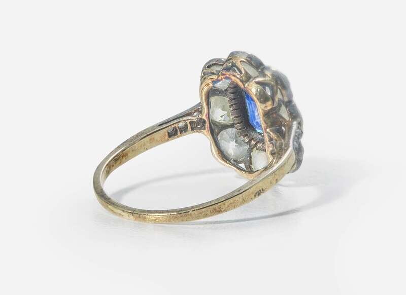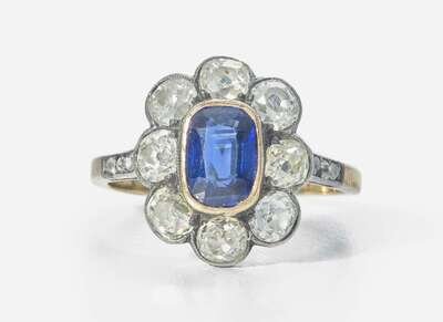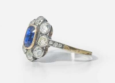 A ladies 14K yellow gold silver topped ring centering an oval-cut sapphire measuring approximately 5.34mm x 7.23mm, surrounded by a halo of old mine-cut diamonds, with further rose-cut diamonds leading down the shank. Diamonds are near colorless to very light yellow (H - P), with SI - I clarity. Total estimated weight of diamonds: 1.40 carats.