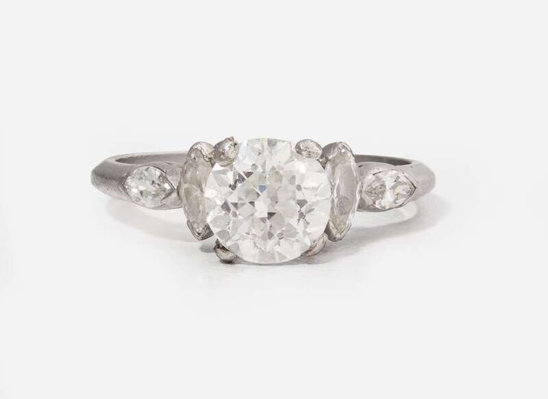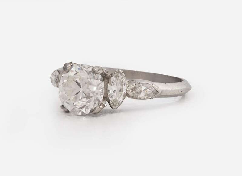 A ladies platinum and diamond ring, centering a 1.51 carat circular brilliant-cut diamond with (E) color, and SI1 clarity, accented by marquise-cut diamonds leading down the shank. Accent diamonds are near colorless (G - J), with SI clarity. Total estimated weight of diamonds: 1.87 carats. Accompanied by GIA Report Number: 5231090678.