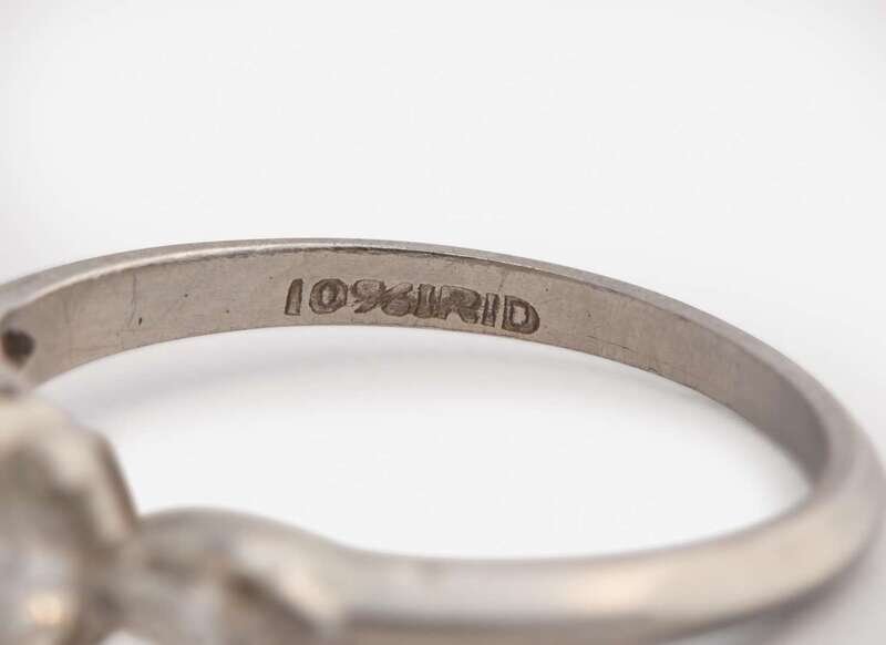 Overall Condition: Scratches and wear to metal, diamond is loose in its setting, damage to prongs, stamped “10%IRID”.