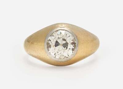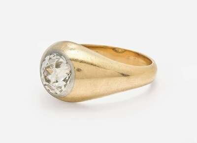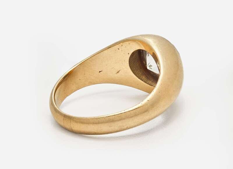 A gentlemen's 14K yellow gold ring, designed as a wide band centering a platinum bezel-set old European-cut diamond weighing approximately 2.40 carats, with faint color (K) and SI clarity.