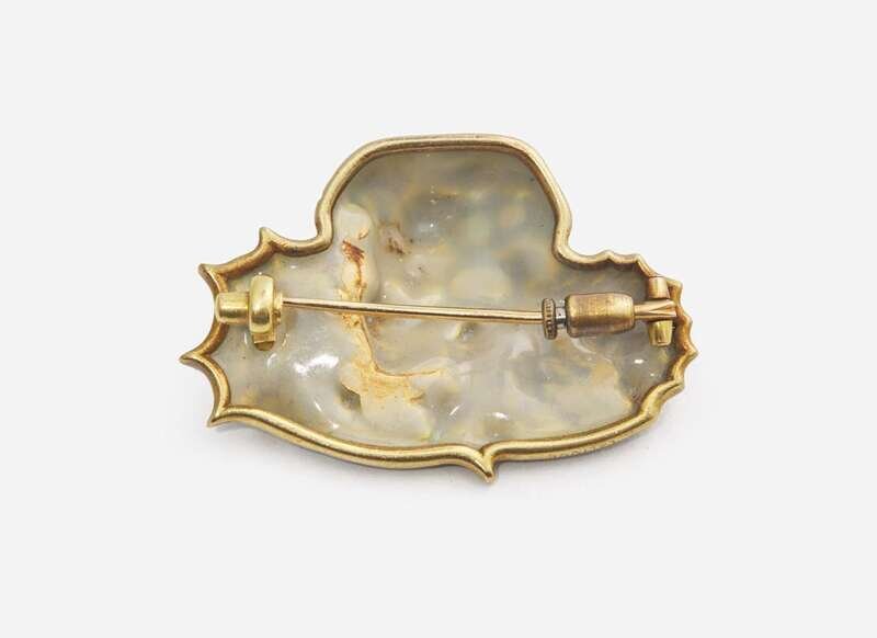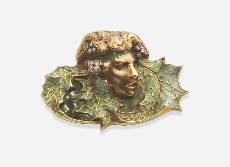 An Art Nouveau era Lalique brooch circa 1900 depicting a lady's profile surrounded by delicate foliage, crafted from 18K yellow gold with shades of green champlevé enameling, accented by petite bezel-set rose-cut diamond accents. The back of the brooch is entirely covered with a light blue enamel, and the brooch fastens with a “c” clasp and pin. Diamonds are near colorless (G - J), with SI - I clarity. Total estimated weight of diamonds: 0.15 carats.