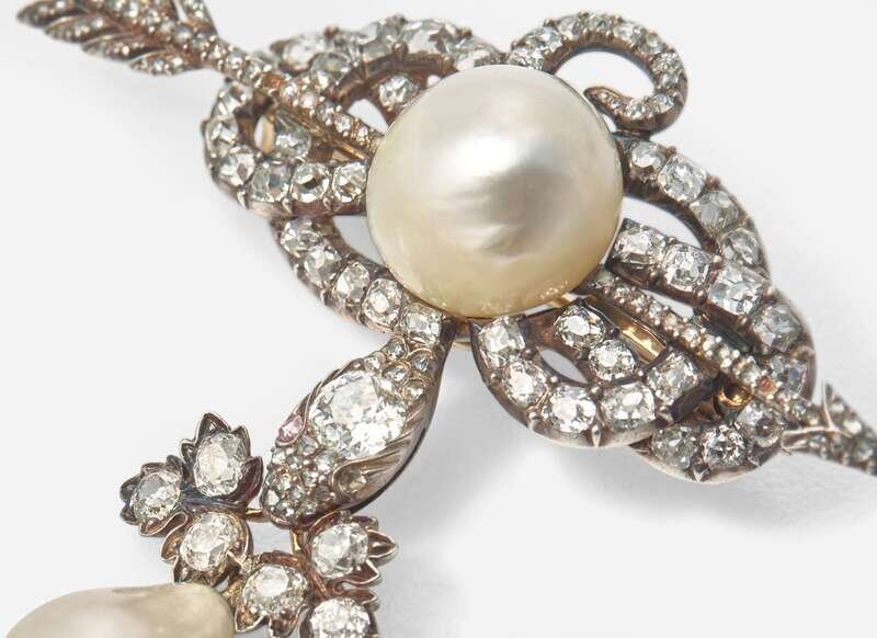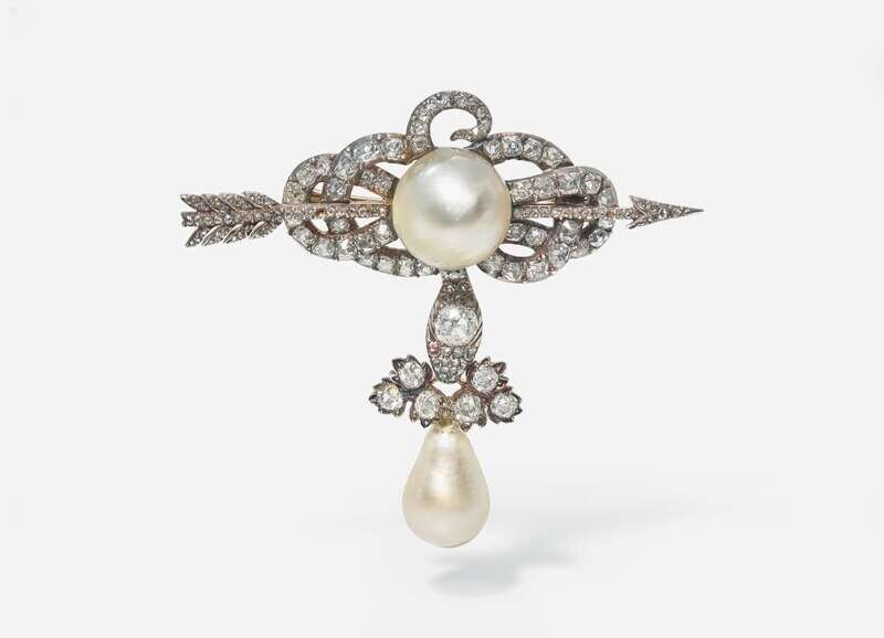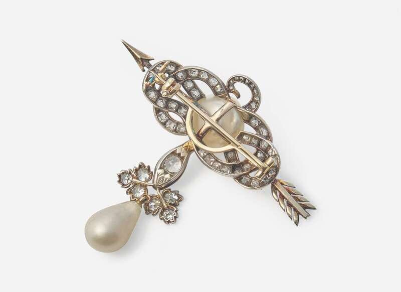 A 14K yellow and white gold brooch attributed to Boucheron circa 1900, depicting an old mine-cut, single-cut, and rose-cut diamond-accented coiled serpent and arrow centering a natural semi-baroque pearl measuring approximately 12.80mm. Below the pearl lies the serpent head se with an old mine-cut diamond weighing approximately 0.40 carats holding in its mouth two tri-leaf branches suspending a natural pearl drop measuring approximately 14.50mm x 9.30mm. Diamonds are near colorless to faint color (G – K), with SI – I clarity. Total estimated weight of diamonds: 2.30 carats. Accompanied by a photo of GIA Report Number: 5151455589.