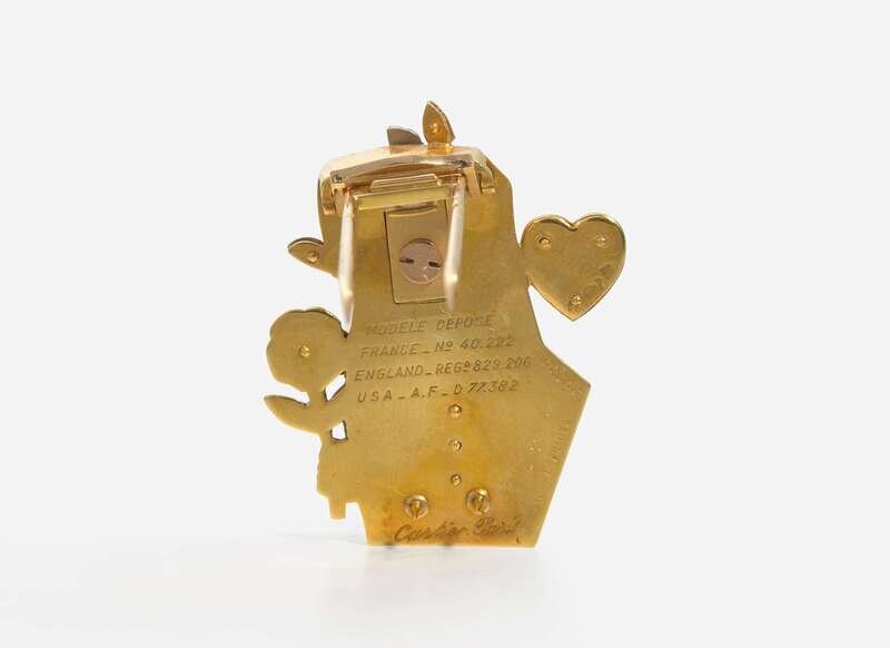King: Minor scratches and wear to metal, minute enamel loss, may require additional cleaning, stamped “Modele Depose, France_No. 40.222, England_Regd 827.832, USA,_A.F_D 77.381, Made in France, 9760 07215 Cartier Paris”, clasp stiff but in working order, set with five rose-cut diamonds each measuring approximately 1.00mm, near colorless (G – J), with SI clarity. Total estimated weight of diamonds: 0.02 carats. Accompanied by Cartier red leather box with snap closure.