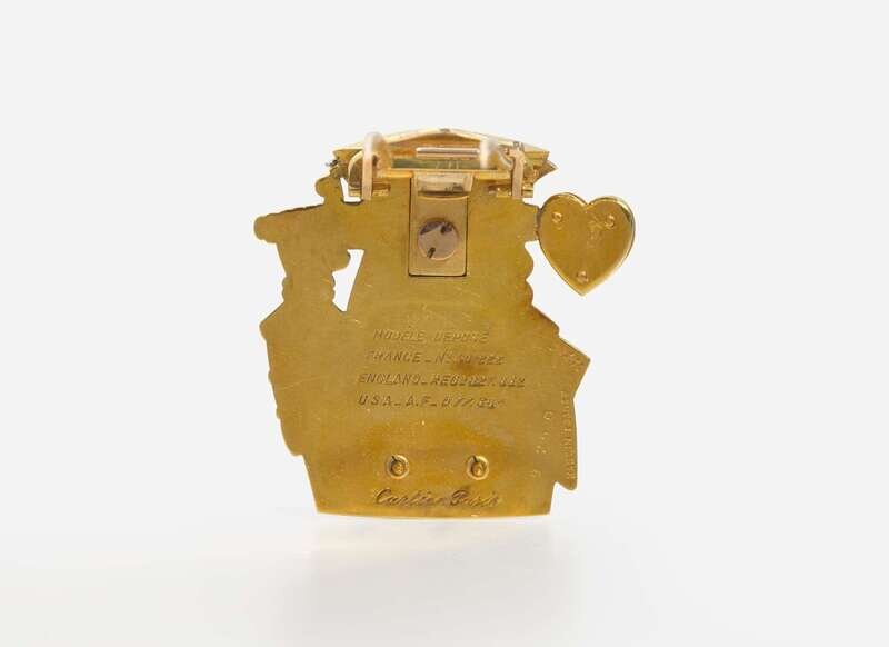 Queen: Minor scratches and wear to metal, minute enamel loss, may require additional cleaning, stamped “Modele Depose, France_No. 40.222, England_Regd 829.206, USA_A.F_D 77.382, Made in France, 9763 07303 Cartier Paris”, clasp stiff but in working order, set with five rose-cut diamonds each measuring approximately 1.00mm and four rose-cut diamonds each measuring approximately 0.78mm, near colorless (G – J), with SI clarity. Total estimated weight of diamonds: 0.03 carats. Accompanied by Cartier red leather box with snap closure.