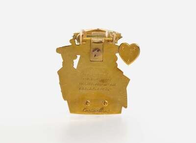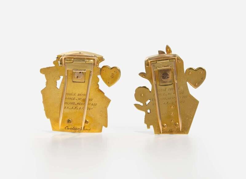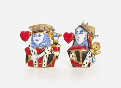 A pair of mid-20th century 18K yellow gold and enamel clips by Cartier, featuring the King and Queen of Hearts, each decorated with red, black, white, and blue enamel, and accented with rose-cut diamonds. Diamonds are near colorless (G – J), with SI clarity. Total estimated weight of diamonds: 0.06 carats.