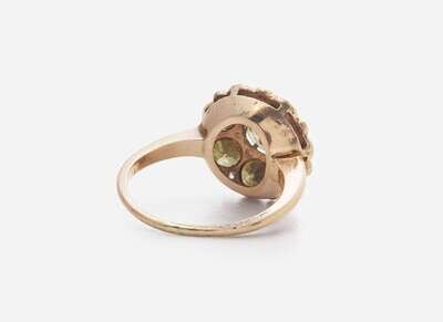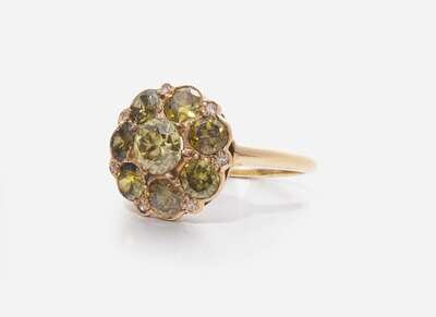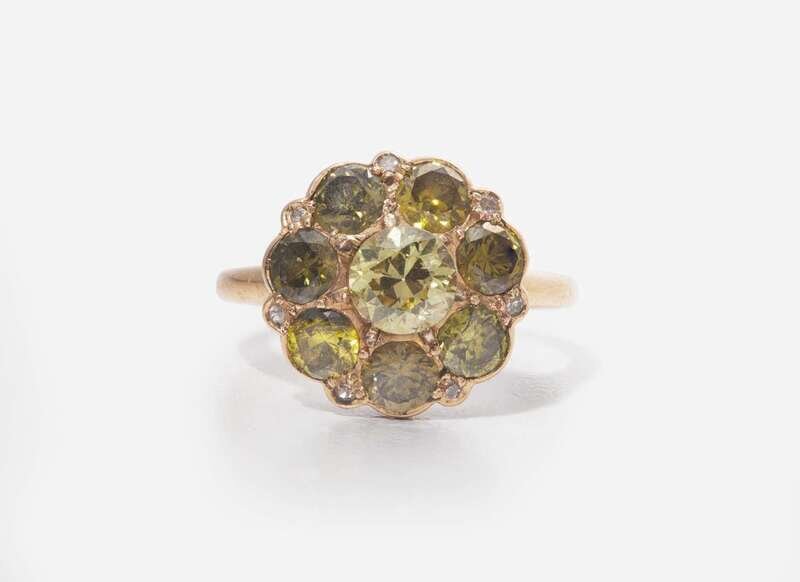Accent Diamonds: Seven round brilliant-cut Fancy Deep Brownish Yellowish Green diamonds each measuring approximately 4.00mm with SI clarity, and seven single-cut near colorless (H - I) diamonds each measuring approximately 1.00mm, with VS - SI clarity. Total estimated weight of diamonds: 2.73 carats.