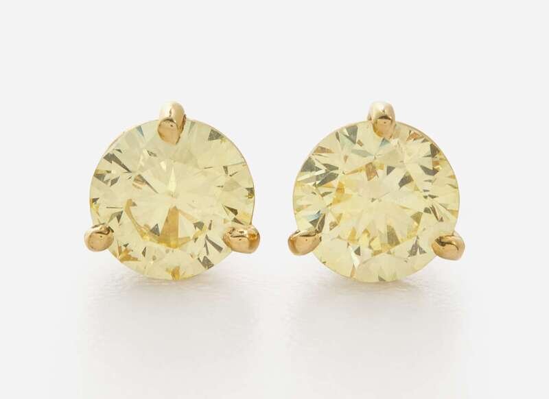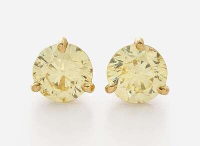 A pair of 14K yellow gold studs, each set with a round brilliant-cut natural fancy yellow diamond in a three-prong martini-style setting, weighing approximately 1.73 carats and 1.52 carats respectively, suitable for pierced ears on stud posts with butterfly earring backs. Accompanied by copy of GIA Report Numbers: 16916614 and 16916610.
