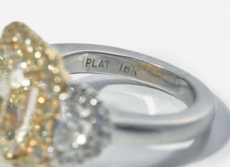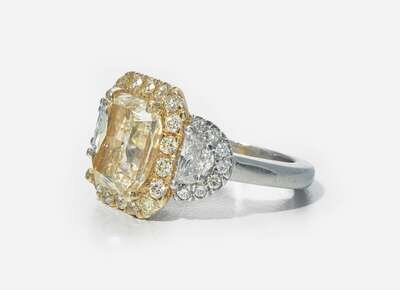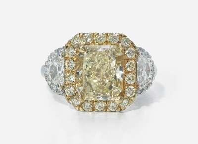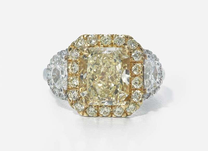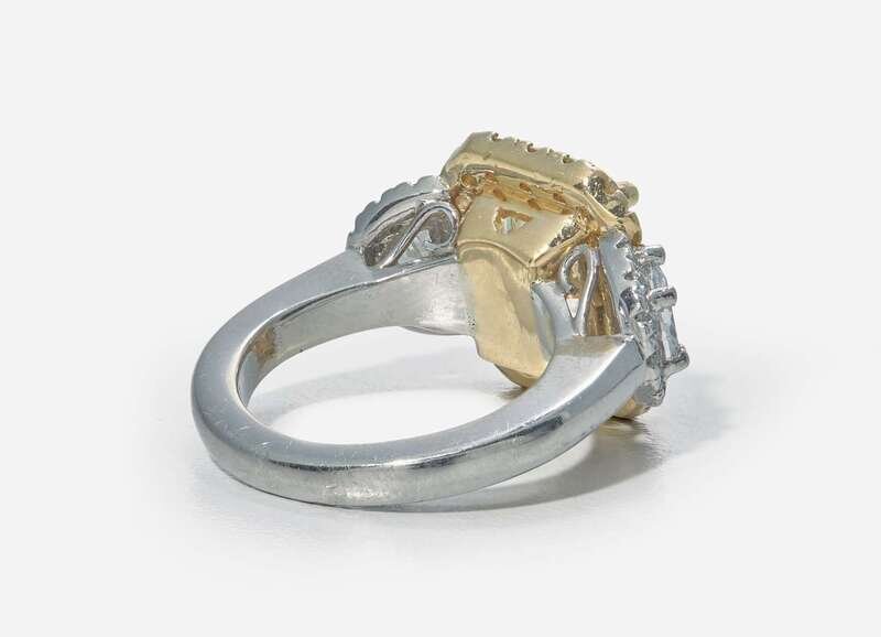 An 18K yellow gold and platinum ring featuring a prominent cut-cornered rectangular modified brilliant-cut 5.12 carat yellow diamond with VS2 - SI1 clarity surrounded by a halo of light yellow (S - Z) round brilliant-cut diamonds in an 18K yellow gold setting, flanked by two half-moon diamonds and further round brilliant-cut diamonds accents, near colorless to faint color (G - L), with SI - I clarity, set in the platinum shank. Total estimated weight of diamonds: 6.58 carats.