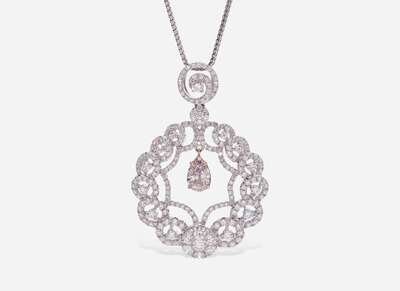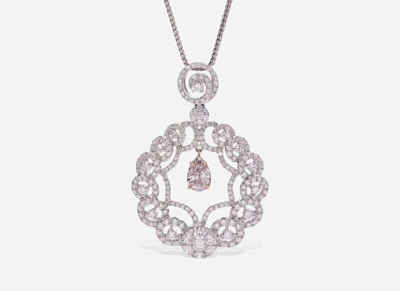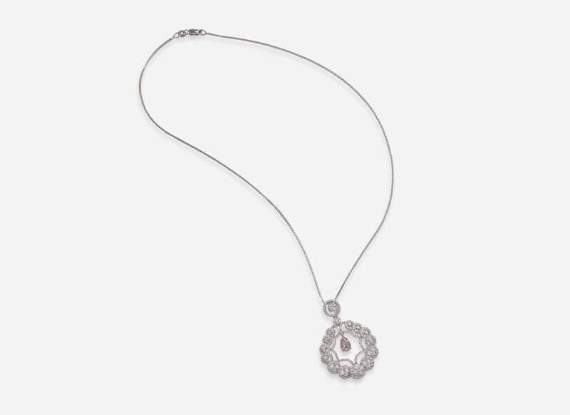 An 18K white gold necklace, featuring a pendant designed as swirls of near colorless round brilliant-cut diamonds forming a wreath, from the center of which dangles a pear modified brilliant-cut fancy light pink diamond weighing approximately 1.11 carats, with VVS2 clarity in a rose gold setting. Accent diamonds are near colorless (G - J), with VS clarity. Total estimated weight of accent diamonds: 3.56 carats.