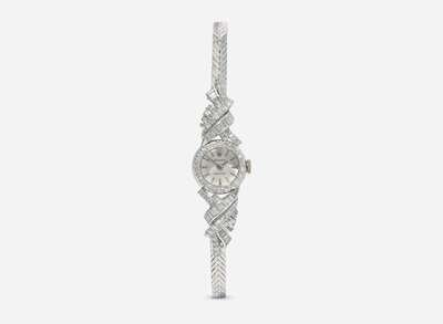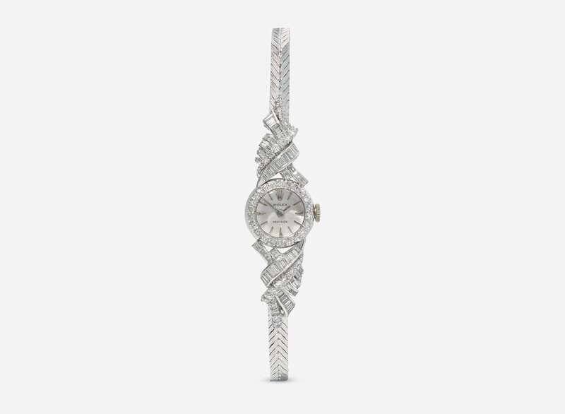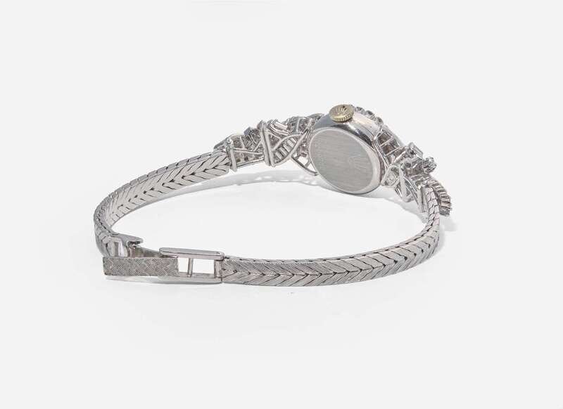 A ladies 14K white gold manual wind Rolex watch, featuring a round dial in a diamond-set 14K white gold bezel, with further accents of single-cut and baguette-cut diamonds, on a 14K white gold woven integrated bracelet. The dial is white, with triangle markers at the 3 o'clock, 6 o'clock, and 9 o'clock hours, the Rolex logo at the 12 o'clock hour, and stick markers at other hour intervals, and stick hands for hours and minutes. Diamonds are near colorless (G - J), with VS - SI clarity. Total estimated weight of diamonds: 1.62 carats.