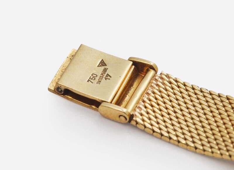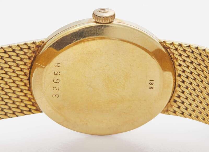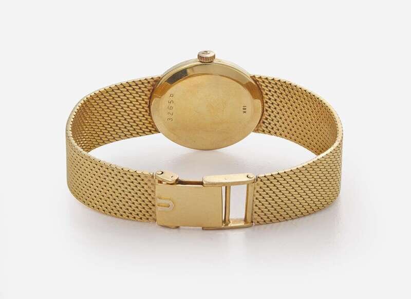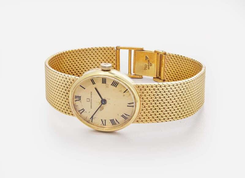 Overall Condition: Some scratches and signs of wear to metal, watch currently running and keeping time, several large scratches to crystal, several areas of damage to watch face, dial reads "UNIVERSAL GENEVE SWISS", back of case marked "18K 32658", clasp stamped "750 SWISS MADE 17", clasp in working order.