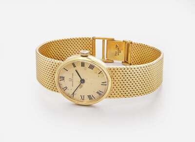 An 18K yellow gold manual wind ladies watch by Universal Geneve, featuring an oval case with a champagne dial depicting black Roman numerals at hour intervals and black stick hour and minute hands. The watch has a fluted yellow gold crown, and sits on an attached woven 18K yellow gold bracelet.