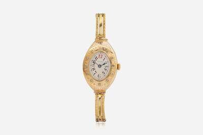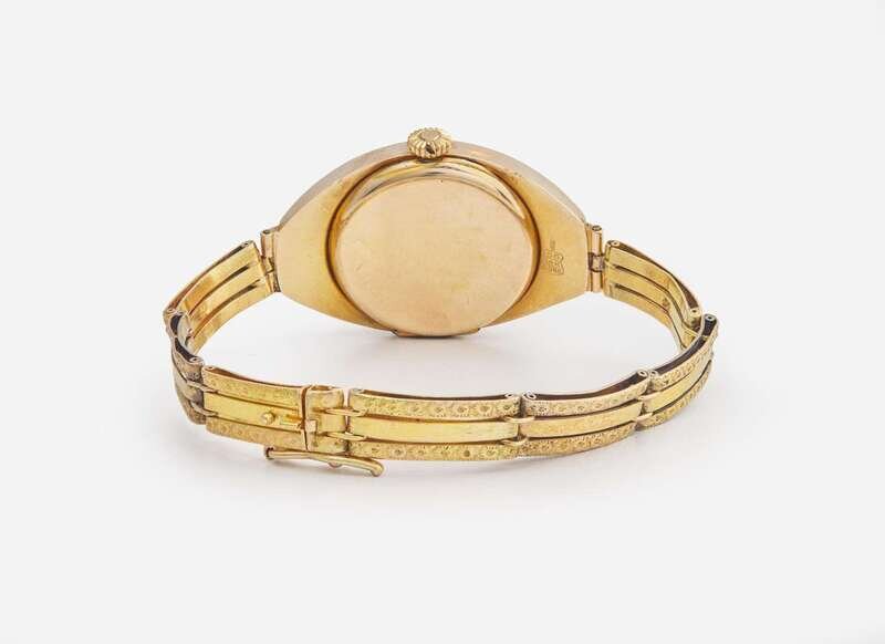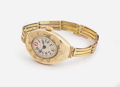 A 14K yellow gold Russian manual wind ladies watch by Invicta, featuring an oval silvery white face with a red Arabic numeral at the 12 o'clock hour and black Arabic numerals at all other hour intervals, as well as black stick markers at minute intervals, and blue arrow hands for hours and minutes. The watch case is set with twelve rose-cut diamonds, and is further decorated with delicate engraving on the watch case and bracelet. The bracelet is designed with textured rectangular links, ending with a box clasp and figure-eight safety latch. Diamonds are near colorless (G - J), with SI clarity. Total estimated weight of diamonds: 0.10 carats.