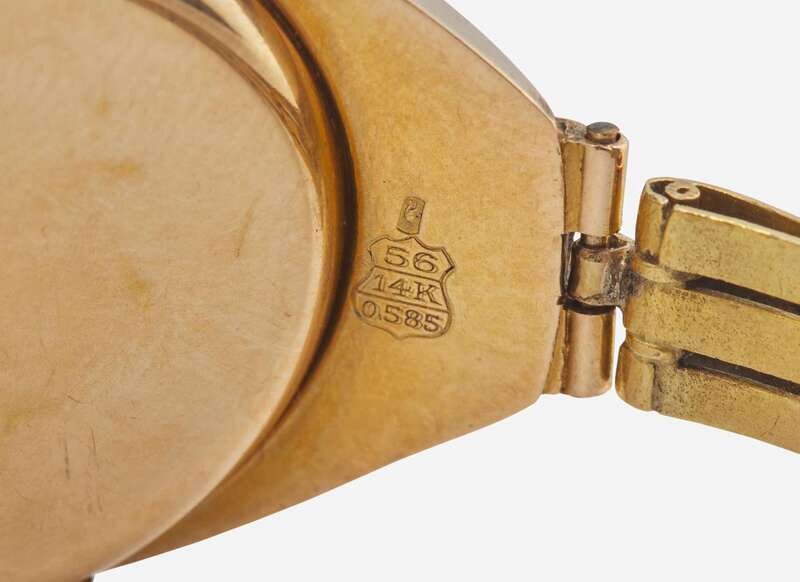 Overall Condition: Some scratches and wear to metal, watch currently running and keeping time when wound, interior of case marked "FRP 56 14K 0.585 119087" with several jeweler's marks, back of case marked "56 14K 0.585" with Russian hallmark, each individual link stamped with hallmark, bracelet clasp stamped "56" with Russian hallmarks, hinge on case back broken, box clasp and figure-eight safety latch in working order, damage to gold on crown, some discoloration to dial, dial reads "INVICTA".