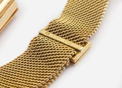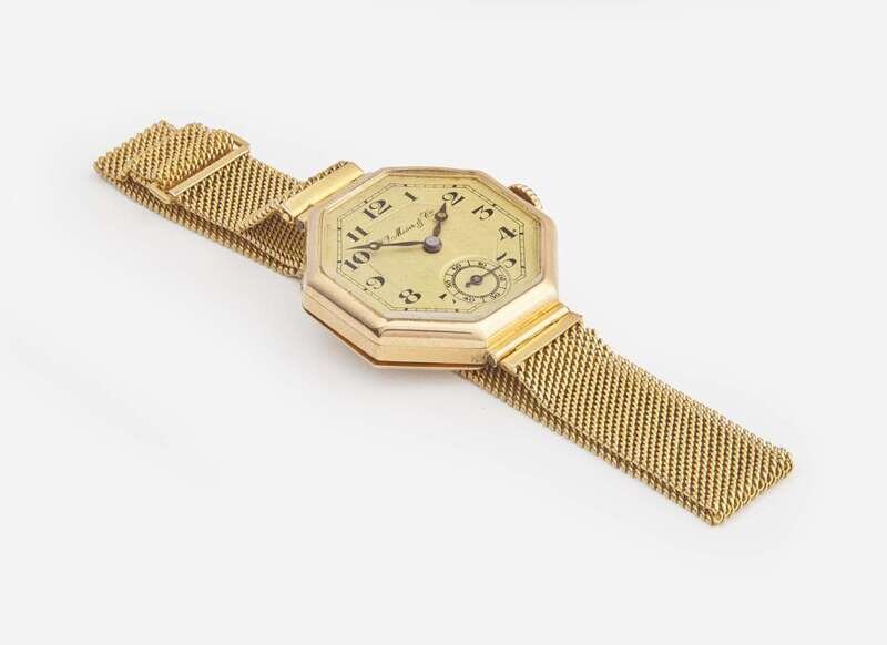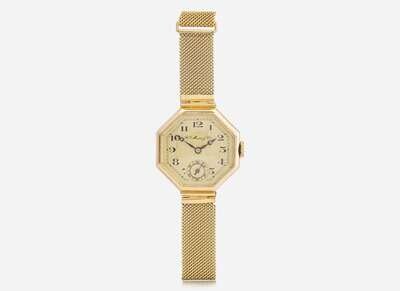 A 14K yellow gold manual wind antique bracelet watch by Moser, featuring an octagonal case with a textured gold colored dial, black Arabic numerals at hour intervals, a seconds complication at 6 o'clock and bluish black arrow hands. The watch sits on an adjustable woven mesh yellow gold-filled bracelet.