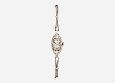 A ladies 10K gold-filled and stainless steel manual wind watch by International Watch Company, designed as an oblong watch case set with round brilliant-cut and single-cut diamonds, on a flexible rope chain bracelet. The dial is white, with black Arabic numerals at hour intervals, and blued steel arrow hands for hours and minutes. Diamonds are near colorless (G - J), with Si - I clarity. Total estimated weight of diamonds: 0.68 carats.