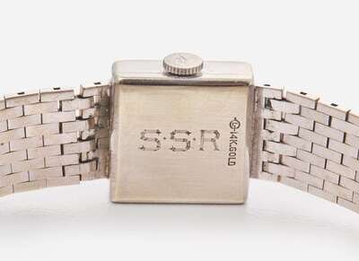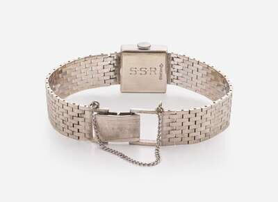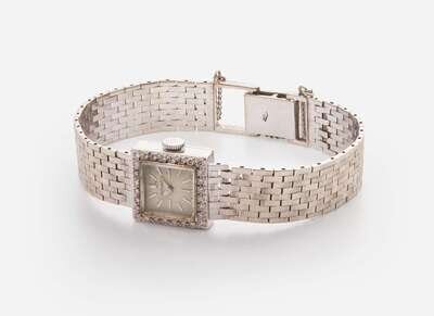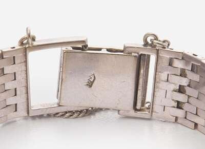 A ladies manual wind 14K white gold watch by Movado, featuring a square case with a diamond-set bezel, on an integrated 14K white gold woven bracelet. The dial is white with white gold stick markers at hour intervals, and white gold hands for hours and minutes. The round brilliant-cut diamonds are near colorless (G - J), with VS - SI clarity. Total estimated weight of diamonds: 0.14 carats.