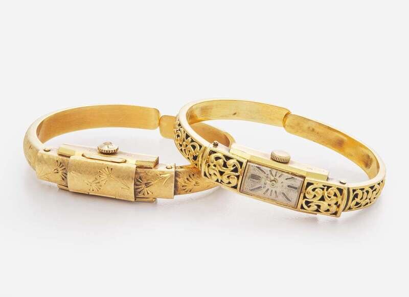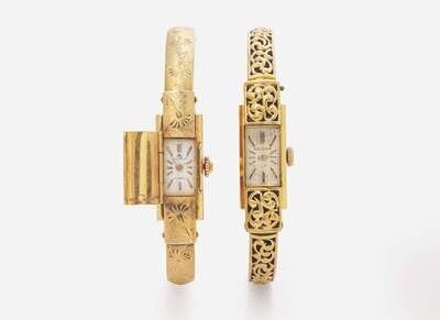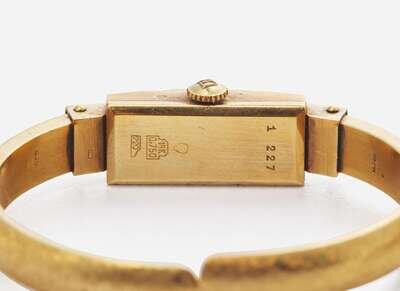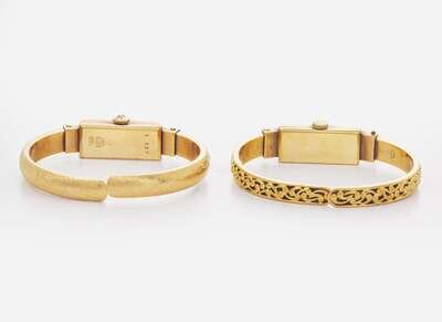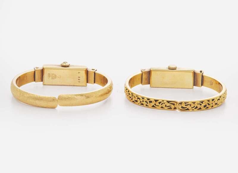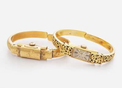 A set of two ladies bangle watches, including a manual wind 18K yellow gold watch by Seega featuring a white rectangular dial with gold stick markers at hour intervals and gold hands for hours and minutes, and a seventeen jewel manual wind Bucherer watch with a hidden dial, featuring a white rectangular dial with gold stick markers at hour intervals and gold hands for hours and minutes.