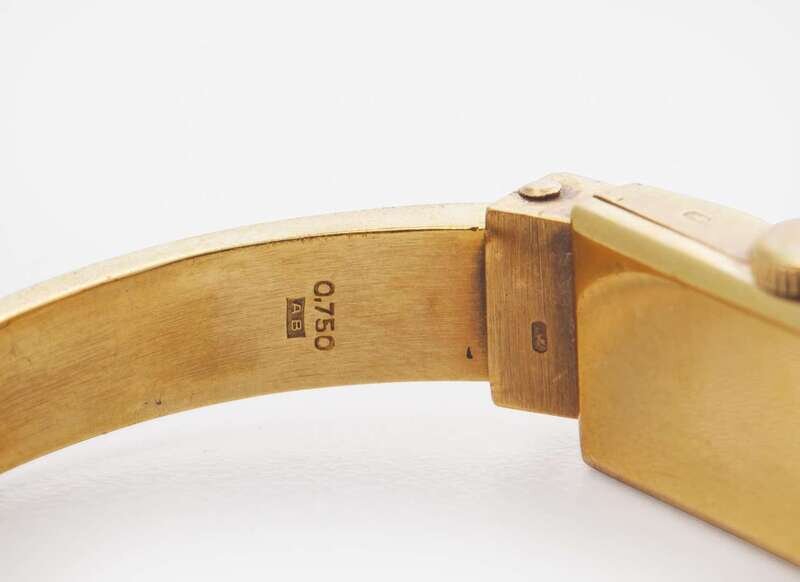 Bucherer Condition: Significant scratches and wear to metal, watch currently running when wound, hinge clasps in working order, hidden dial mechanism in working order, significant scratches to crystal, damage and discoloration to dial, dial reads "BUCHERER 17 JEWELS SWISS", back of case reads "1 227 18K 0.750 220", bracelet reads "0.750".