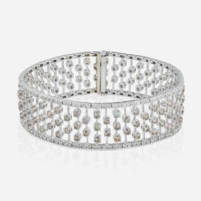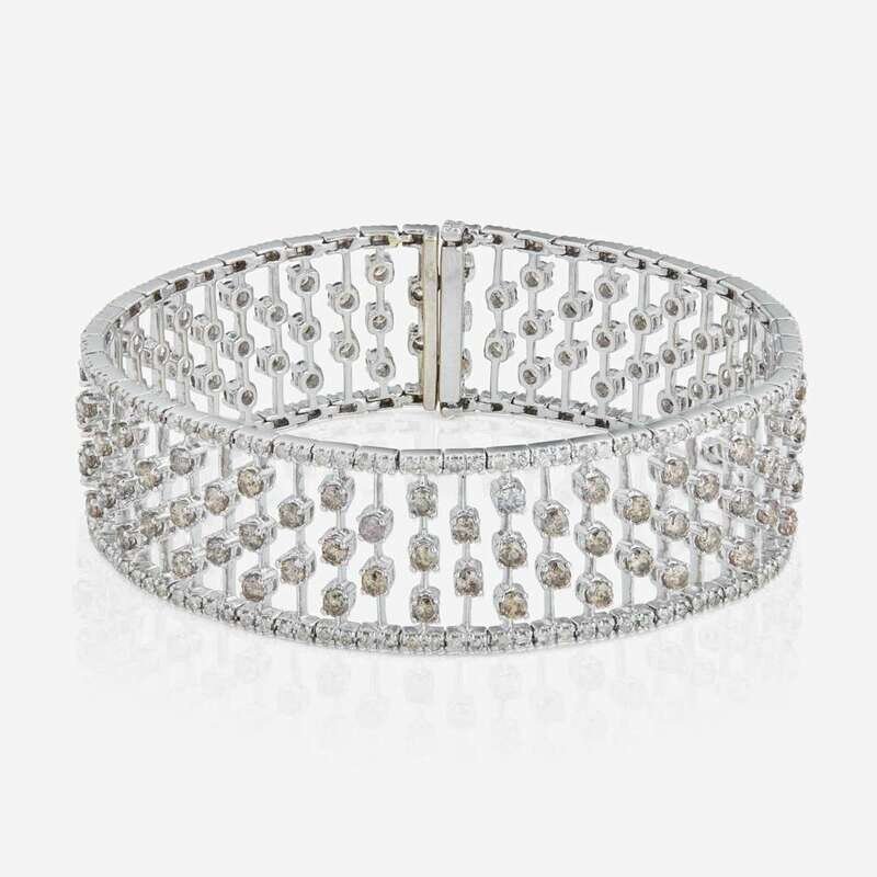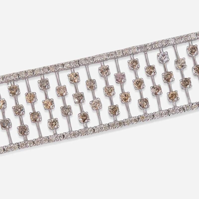 An 18K White gold platinum bracelet designed as delicate stripes of variously colored diamonds, including round brilliant-cut near-colorless, brown, and yellow. Total estimated weight of diamonds: 7.50 - 8.00 carats.