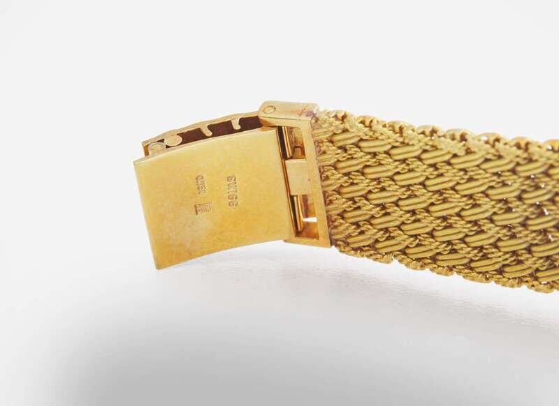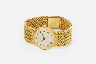 An 18K yellow gold manual wind ladies watch by Beuche Girod, featuring a round case with an all-over patterned textured champagne dial with black Roman numeral markers at hour intervals, and black stick hands for hours and minutes. The watch features a textured yellow gold bezel with a fluted crown, on an attached woven mesh 18K yellow gold bracelet with a textured yellow gold clasp.
