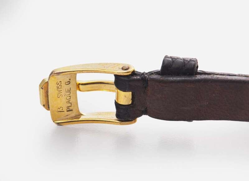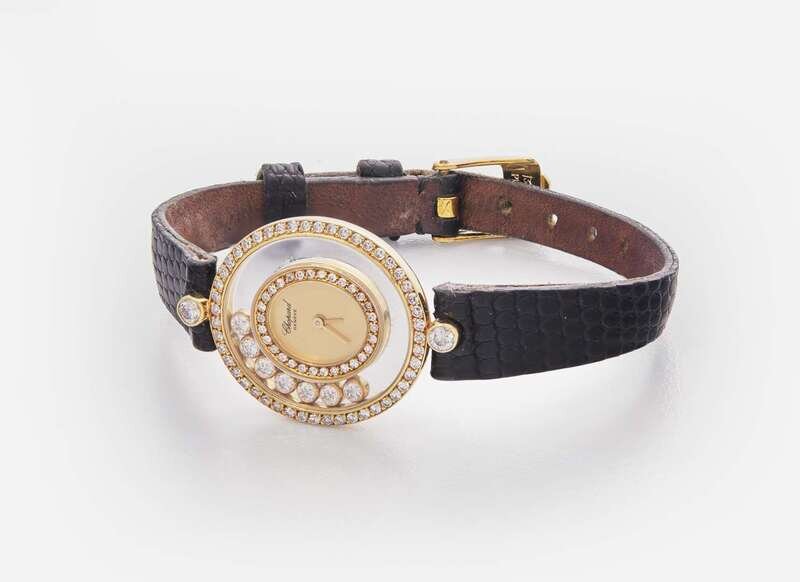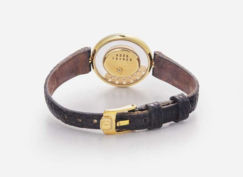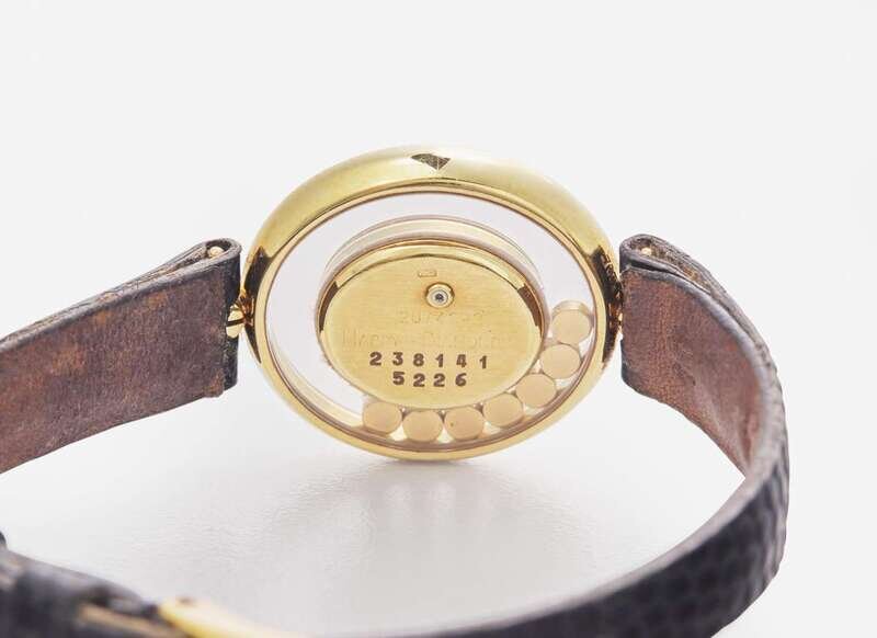 Overall Condition: Some scratches and wear to metal, significant wear and damage to leather bracelet, watch not currently running, may require servicing, dial reads "Chopard GENEVE SWISS MADE", case stamped "750", back of case reads "20/4392 Happy Diamonds 238141 5226", bracelet reads "10 Chopard", buckle reads "SWISS PLAQUE G".